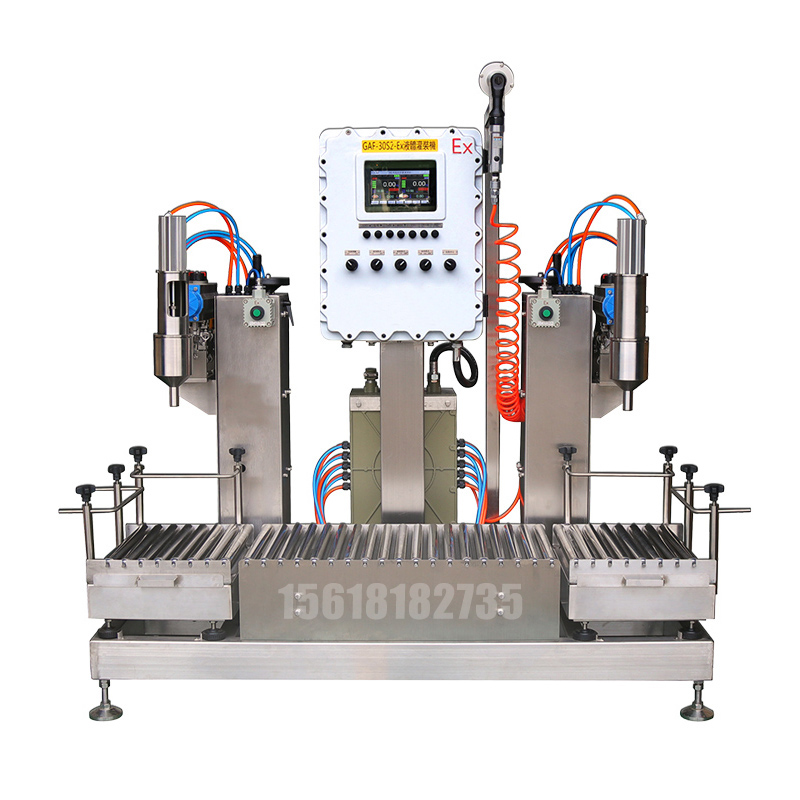 液體雙頭灌裝機GAF-30S2-Ex液體雙頭灌裝機系統采用可編程PLC控制、全中文引導操作,性能可靠;灌槍整體工藝制作,杜絕滴漏、防飛濺;快拆接頭,拆洗方便;穩定性好、減少損耗、節約成本,提高作業效率,減少人工操作壓力。應用范圍:適用于化工、食品、醫藥等原料定量之灌裝。基本參數:1、電源:AC220V 50/60HZ 0.2KW 氣源:0.5~0.7 Mpa2、灌裝量:10~30kg